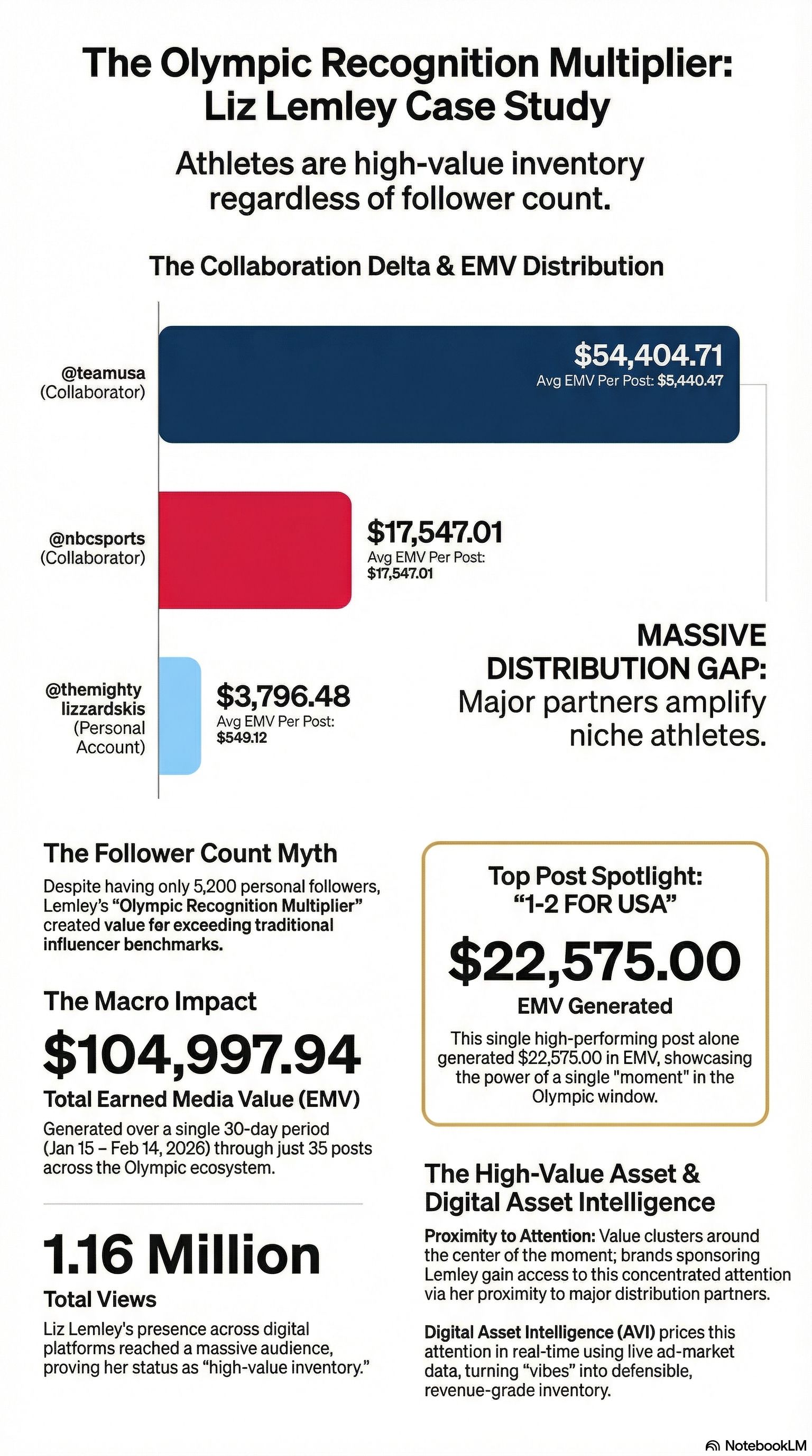 The 30-Day Result: Her Olympic window generated $104,997 in total EMV and 1.16 million views across just 35 posts.